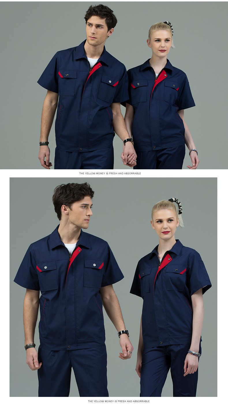 藏藍色加棗紅領(lǐng)短袖工作服,適用于物流運輸,建筑工地,工廠車間等工作環(huán)境