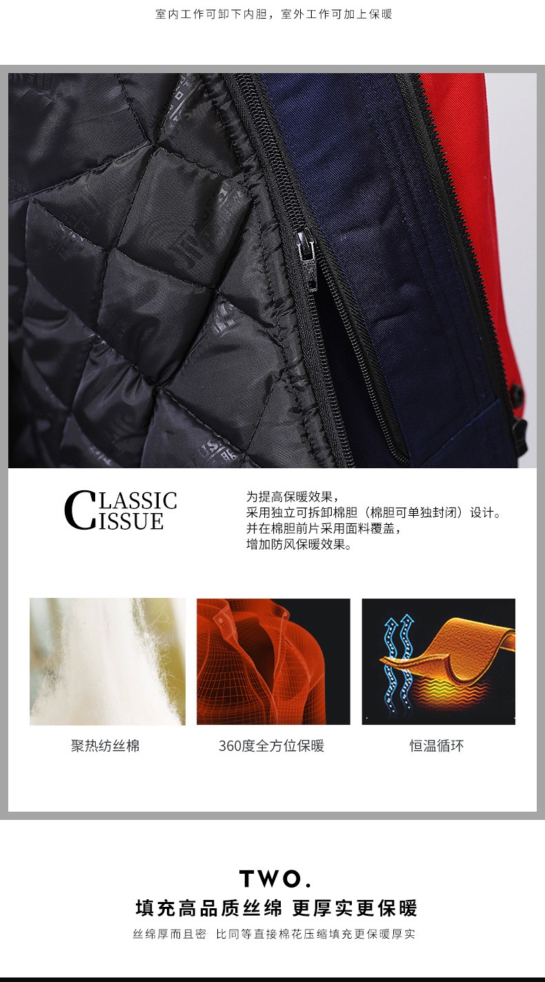 其次,冬季棉衣工作服在設(shè)計上也向時尚界看齊,不再像以前那樣一板一眼,更多的融入了當(dāng)下的流行元素,比如拼色、撞色,可拆卸的帽子和中長款的版型設(shè)計都是新的突破。袖口、領(lǐng)子等細(xì)節(jié)地方也是有過用心設(shè)計的,兼顧了使用和美觀。