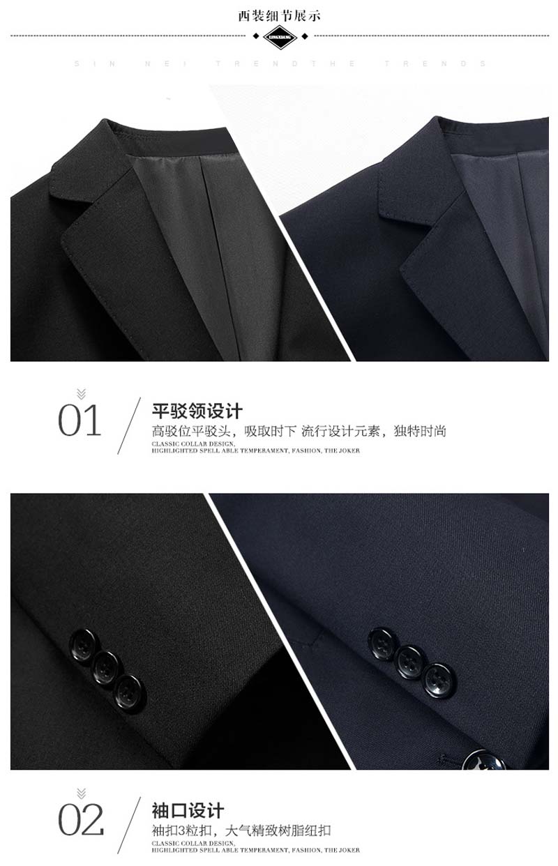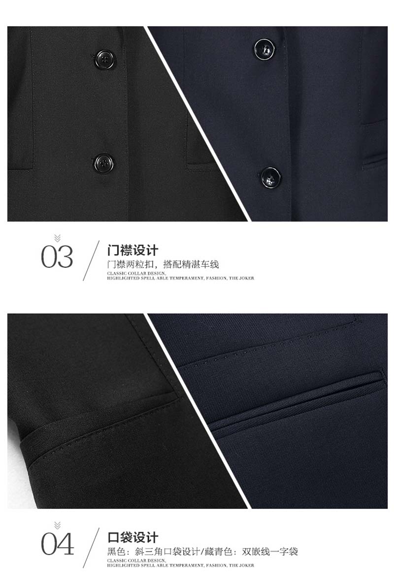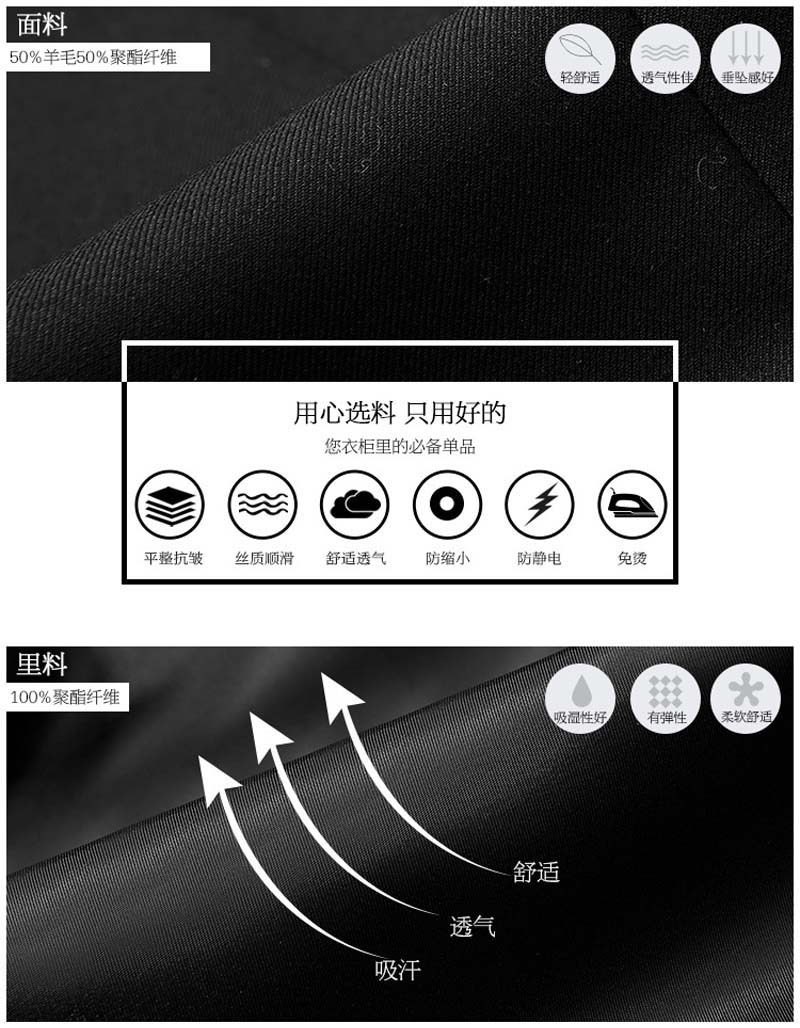 特 點:黑色、藏青兩色可選,高檔羊毛面料,含毛量50%,不易起皺,易打理,有型更舒適。
